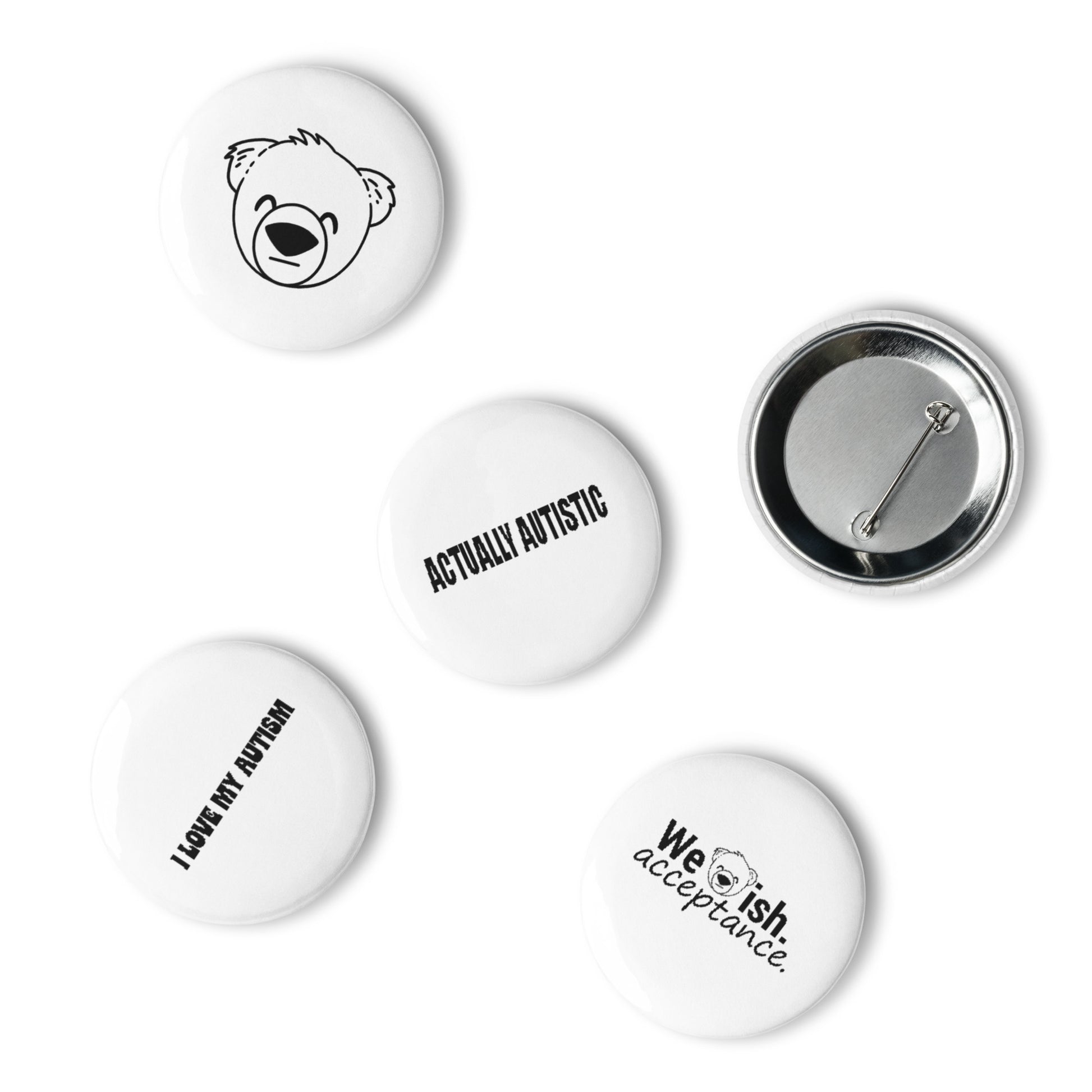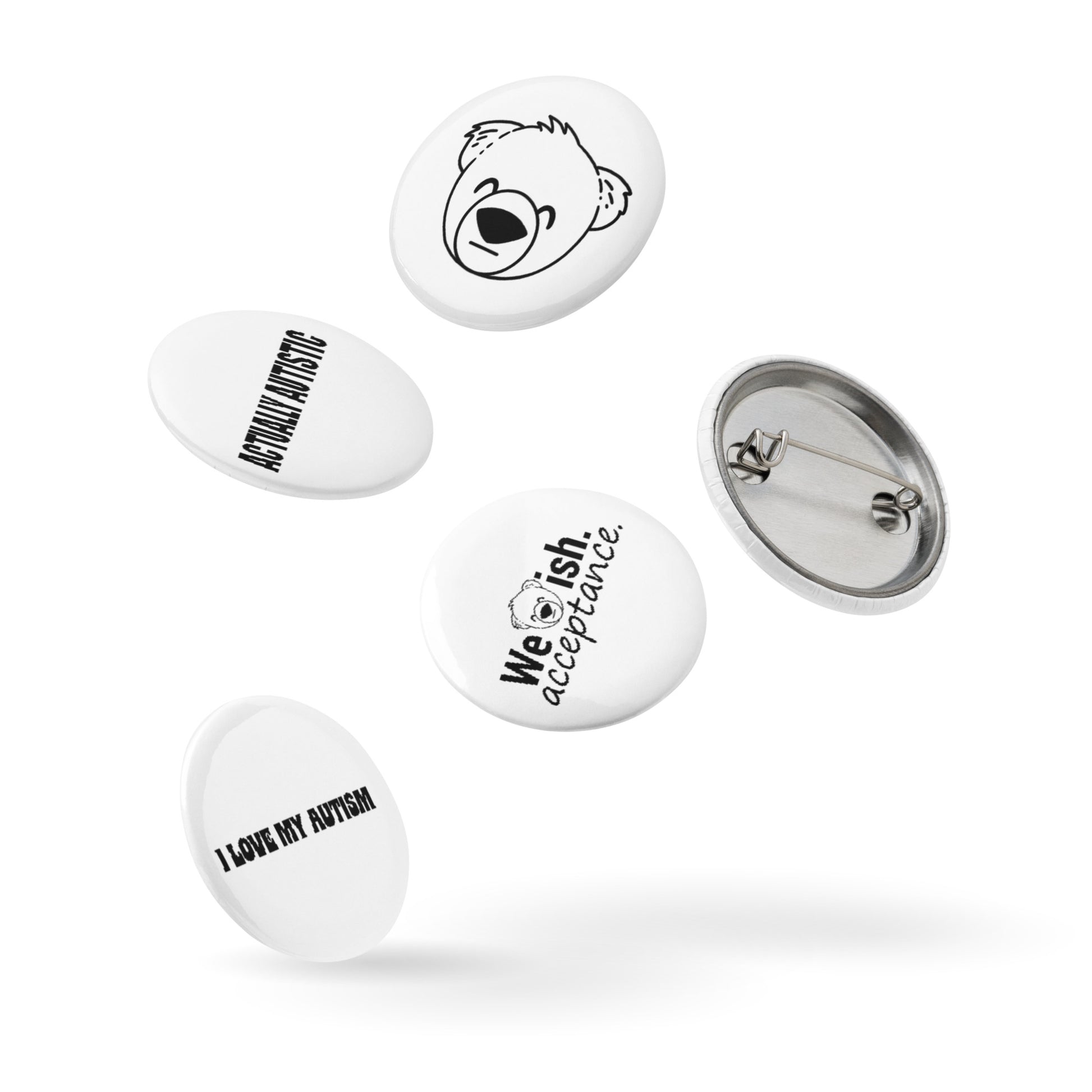 Elevate your self-expression with our WeBearish Autism Acceptance Pin Set. Each set includes five top-quality pin buttons crafted from durable tinplate, ensuring they withstand the test of time. Our scratch and UV-resistant mylar coating guarantees vibrant designs that won't fade, while the glossy finish adds a touch of elegance to your attire or accessories. These pins are not just a fashion statement; they are a symbol of support for our 100% nonprofit organization dedicated to promoting autism acceptance. Wear them with pride and contribute to our mission. Show the world what matters to you while making a meaningful impact. Shop now and be a part of the WeBearish movement for autism acceptance.